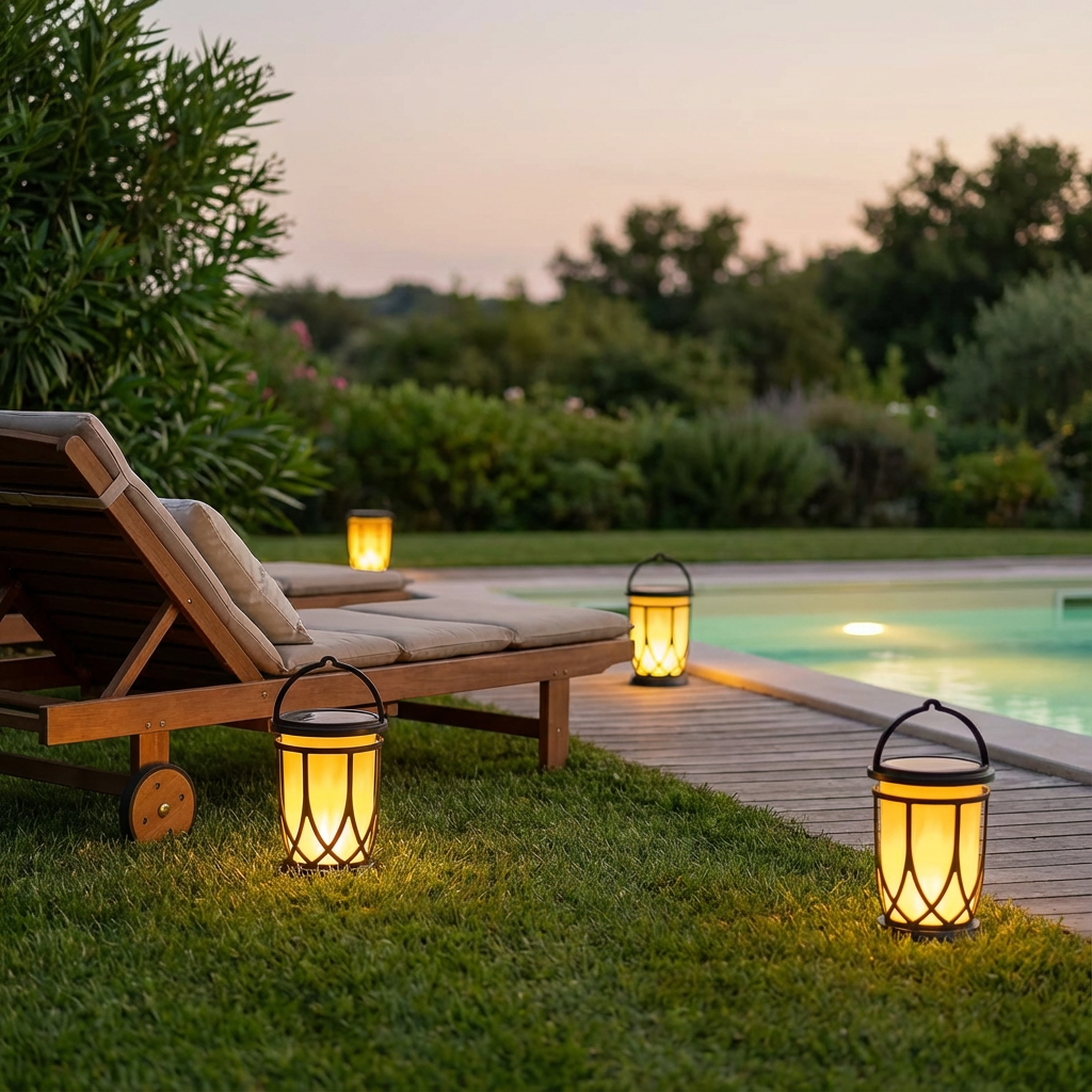 Placed around loungers and poolside lawns, these lantern lights create a calm, welcoming glow that enhances evening relaxation. The warm illumination blends naturally with garden landscapes, turning outdoor spaces into serene retreats after sunset.